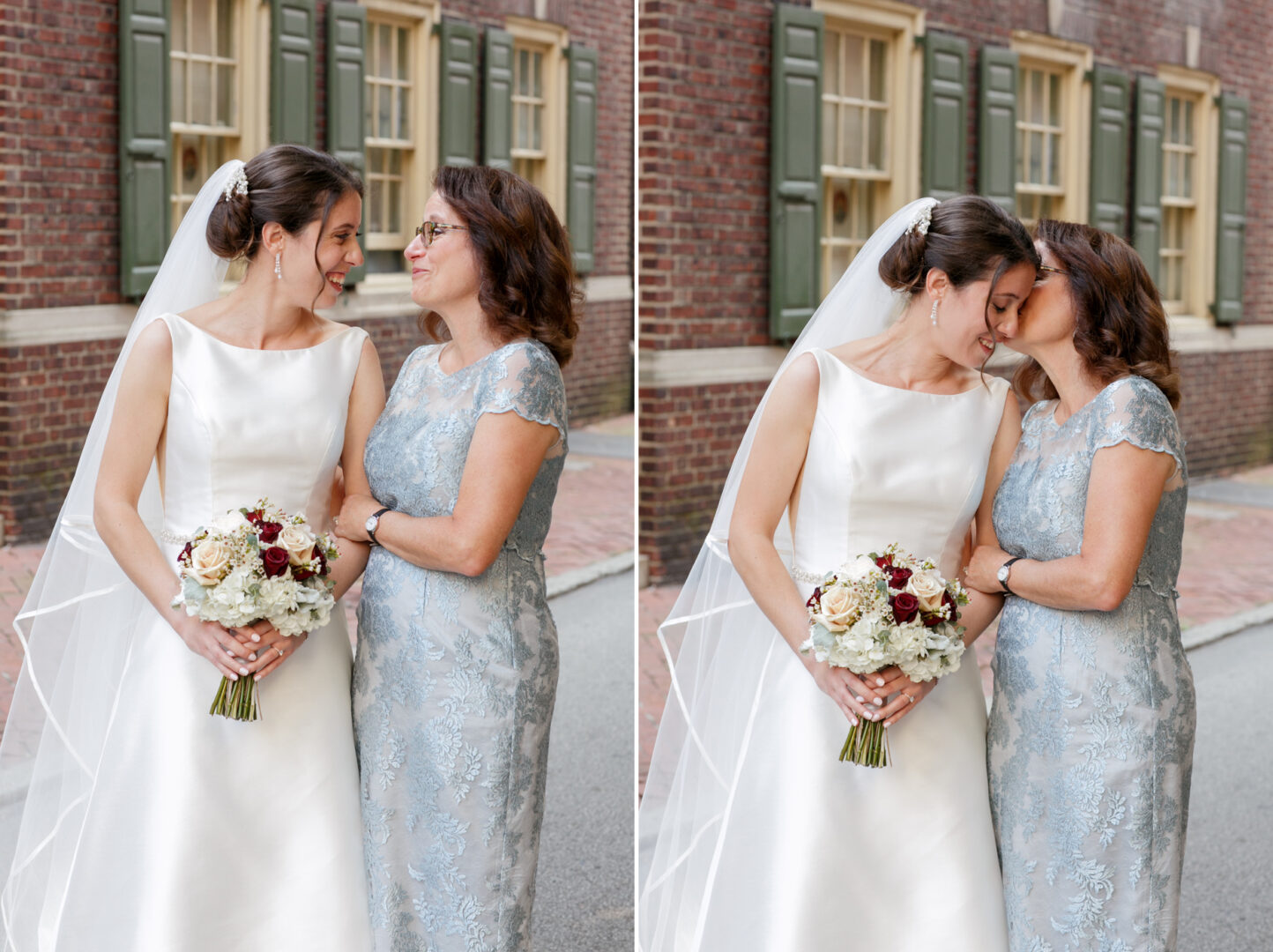 A bride in a white dress and veil poses with a woman in a light blue dress against the historic brick building, reminiscent of a Colonial Dames wedding. In one image, they smile; in the other, the bride kisses the woman's cheek.