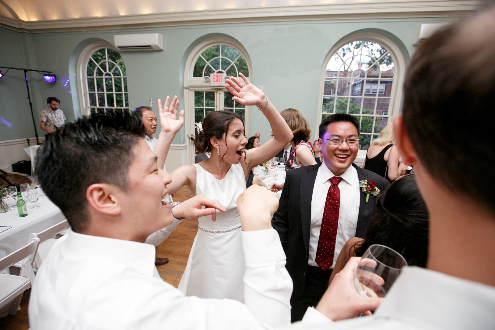 Wedding guests dance and celebrate in a Colonial Dames hall with arched windows. A woman in a white dress raises her arms, while a man in a suit smiles.