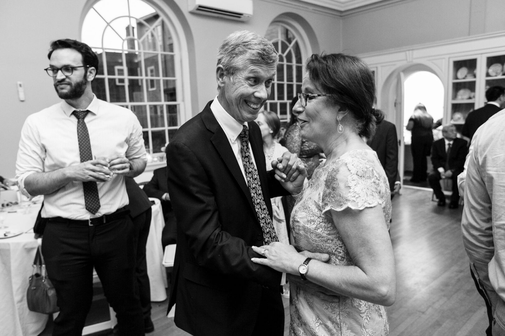 At a Colonial Dames event, a man and woman in formal attire stand smiling and holding hands, as wedding guests mingle in the background.