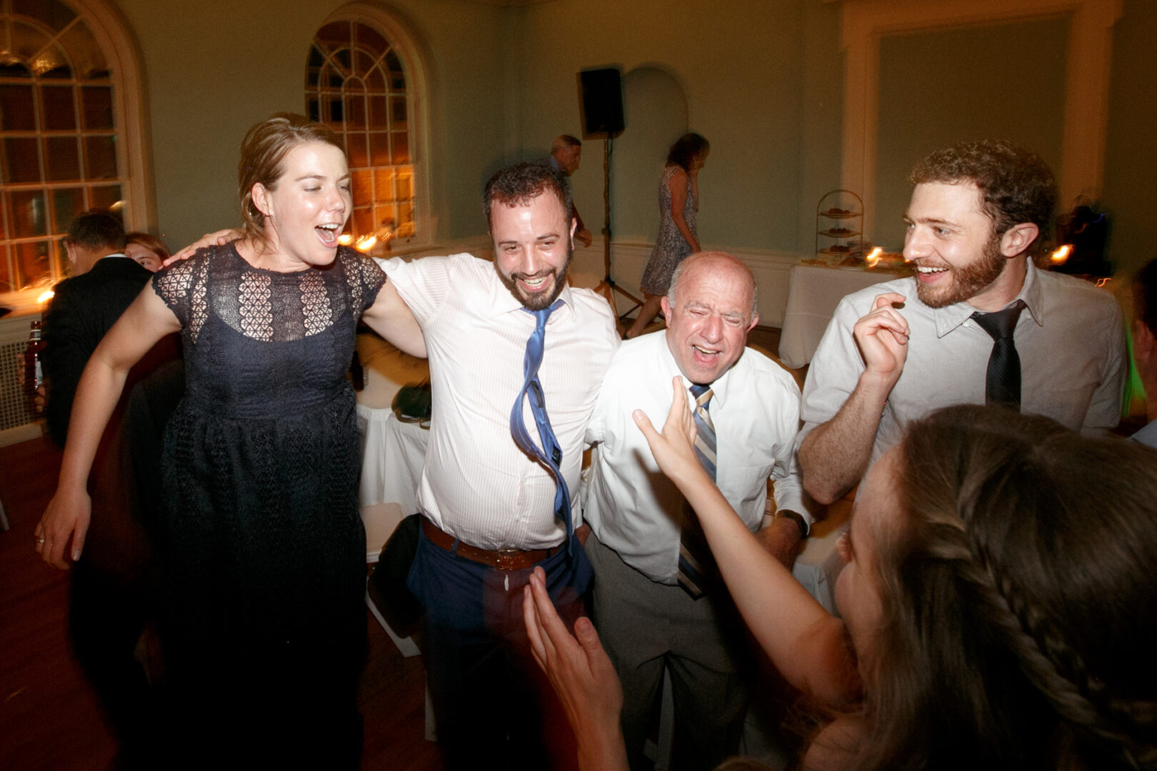 Amidst the grand colonial dames decor, a group of four people smiles and dances joyfully in a room with large arched windows, while a person in the foreground gestures toward them, evoking the celebratory spirit of a wedding.