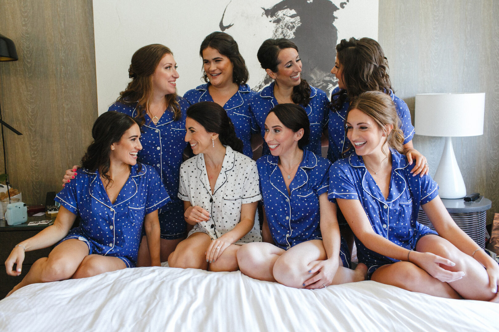 Eight women sitting on a bed, wearing matching blue pajamas with white polka dots, except for one in a different pattern, are all smiles as they share a joyful moment together. You'd almost think they're reminiscing about their unforgettable Franklin Institute wedding experience.