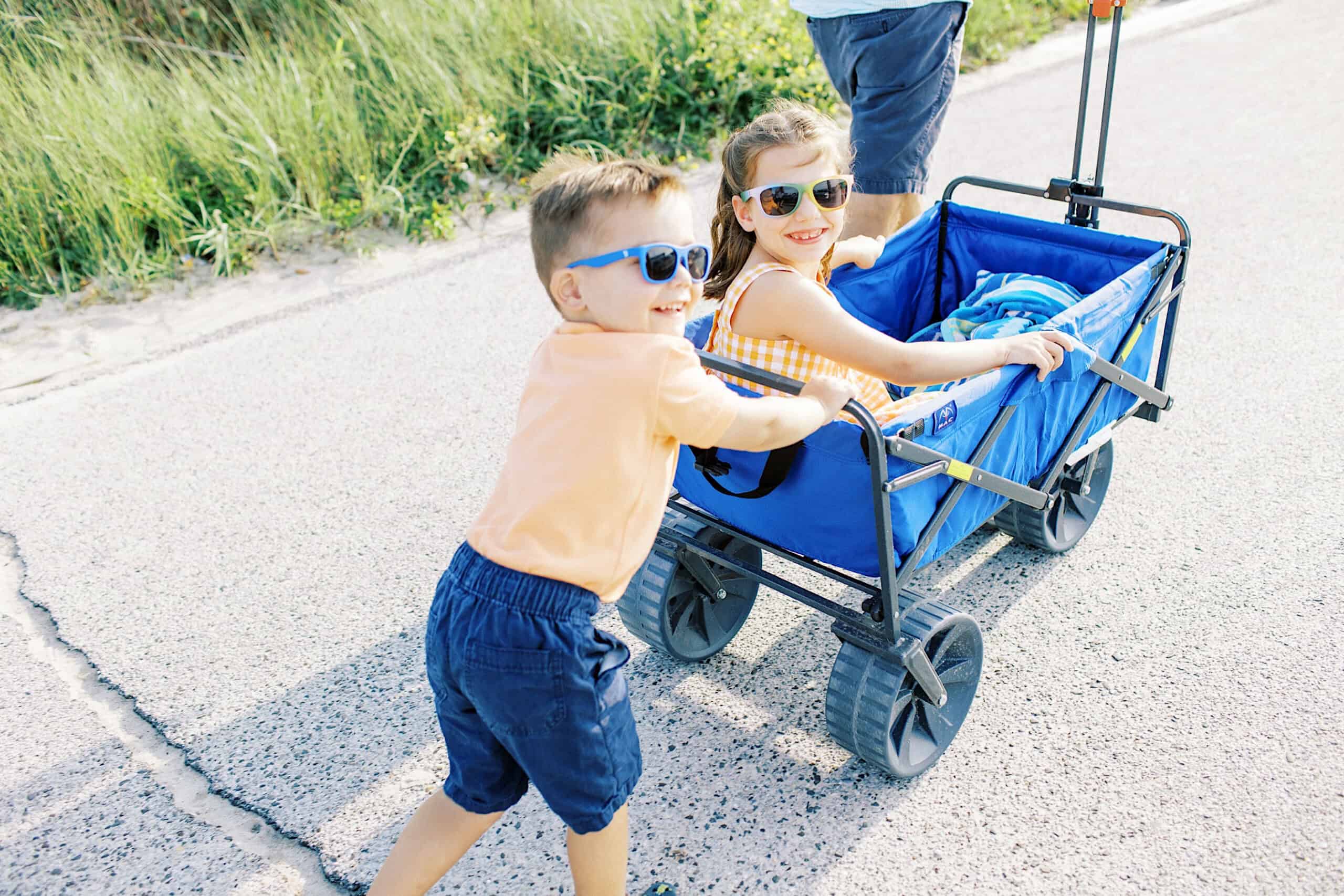 Two young children in sunglasses, one pushing and one riding in a blue wagon, enjoy a paved path outdoors with an adult nearby—capturing the joyful spirit of family photos on Cape May Beach in New Jersey.
