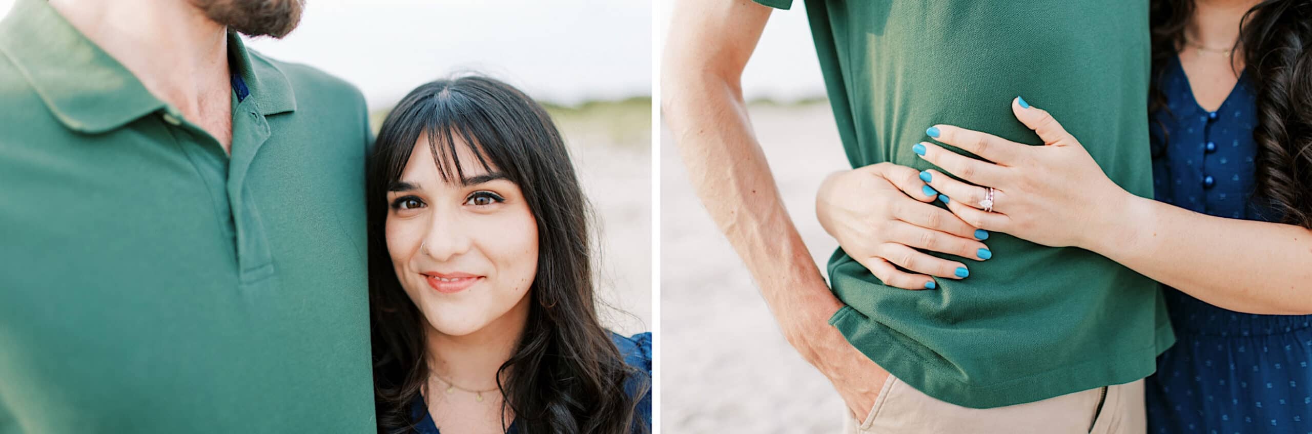 Woman with dark hair stands beside a man in a green shirt; her hand, showing an engagement ring, rests on his side in this close-up of family photos on Cape May Beach in New Jersey. Both are outdoors.