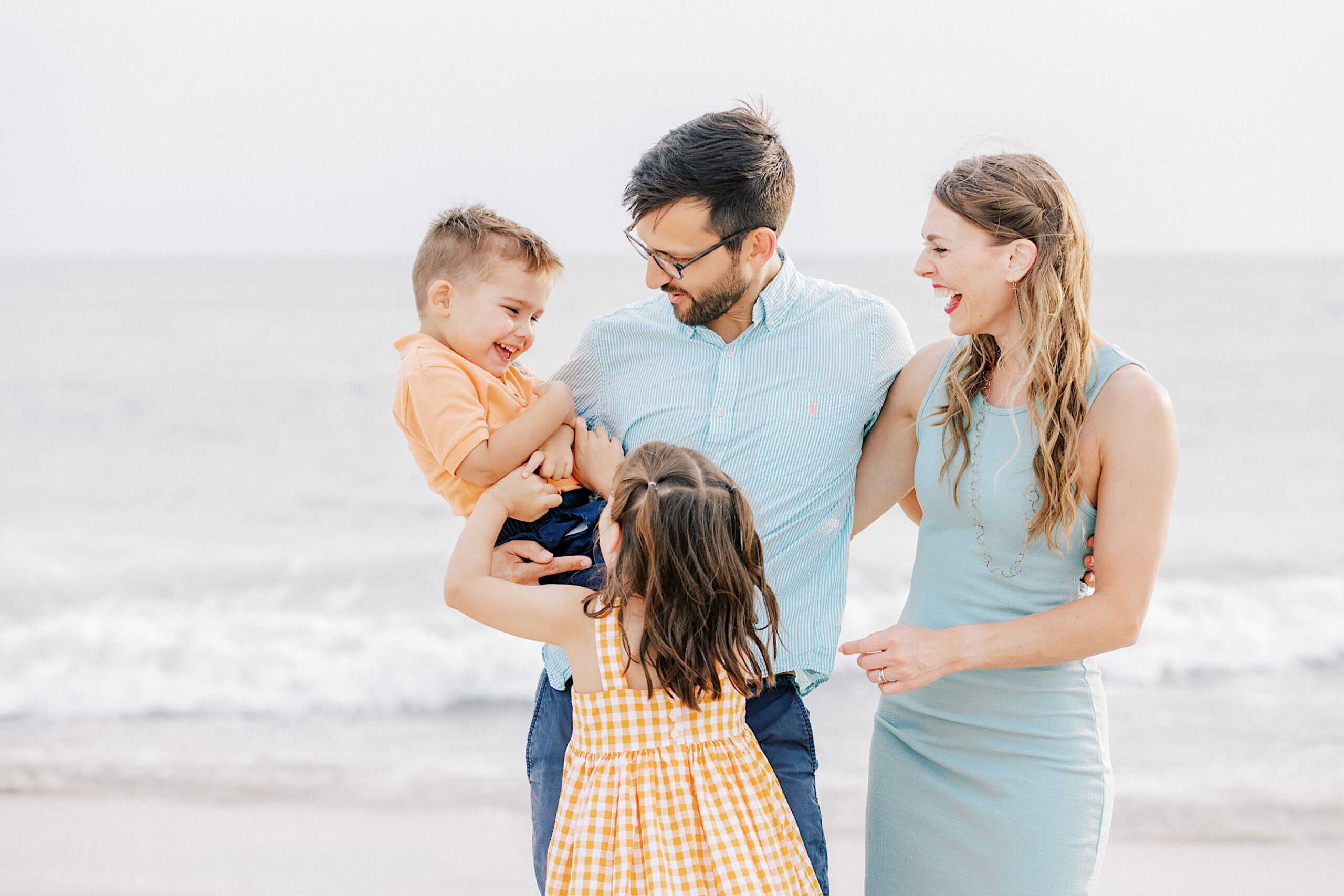 A family of four stands on Cape May Beach in New Jersey; the father holds a young boy, a woman smiles, and a girl in a yellow dress faces them. The ocean serves as the backdrop for their cherished family photo.