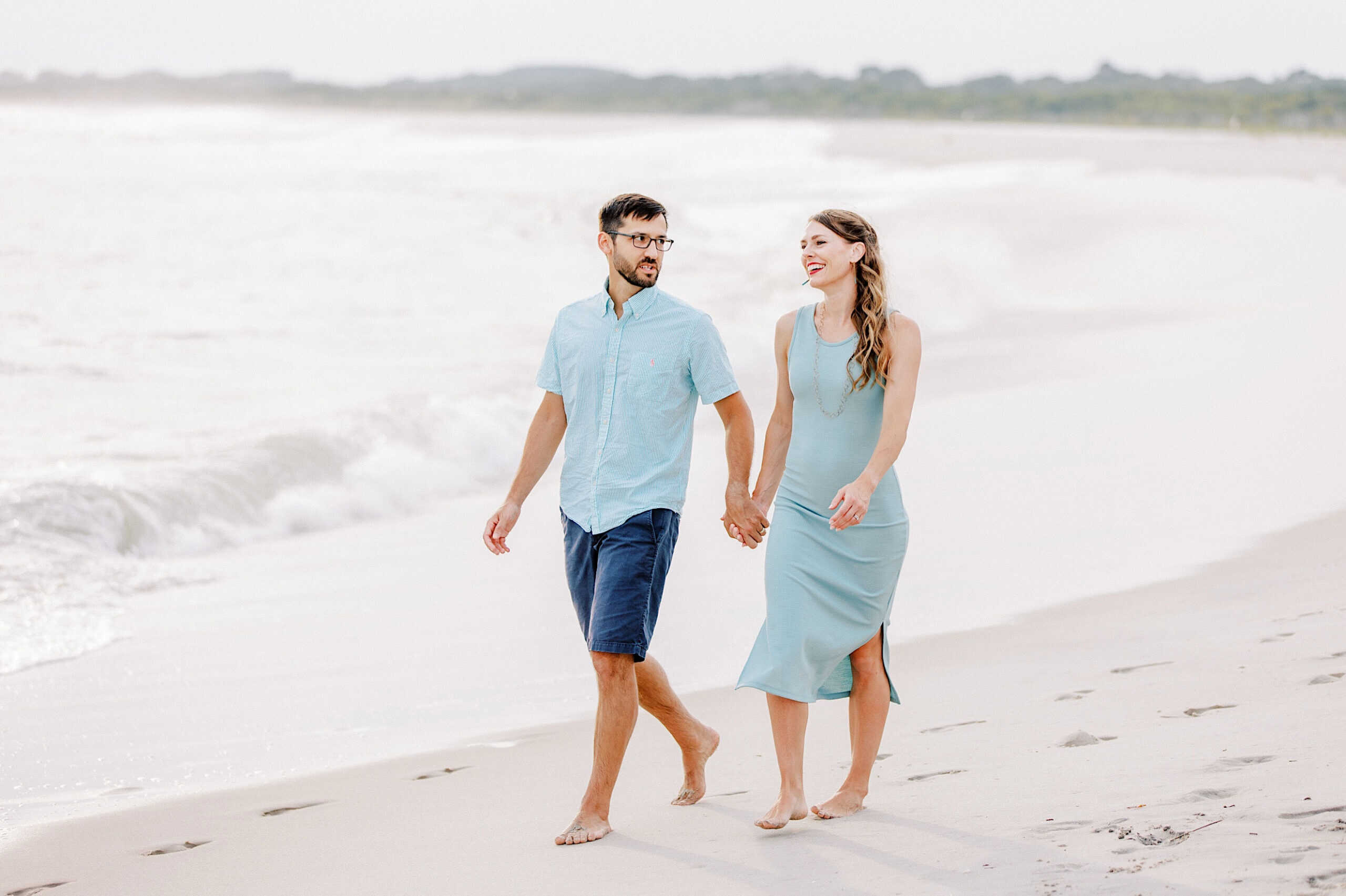 A man and woman walk barefoot, holding hands along a sandy beach with waves in the background—an idyllic moment inspired by family photos on Cape May Beach in New Jersey.