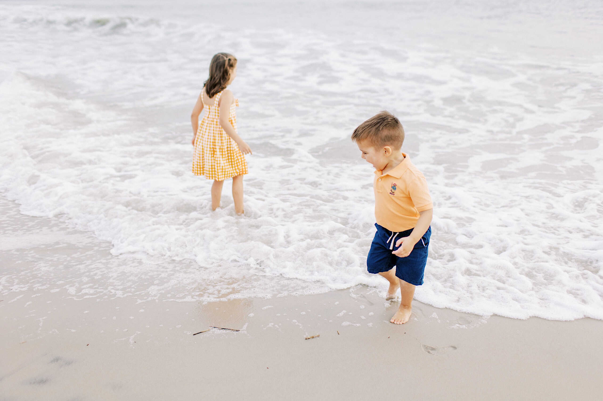 Two young children stand at the edge of the ocean with their feet in the shallow water, capturing a sweet moment perfect for family photos on Cape May Beach in New Jersey.