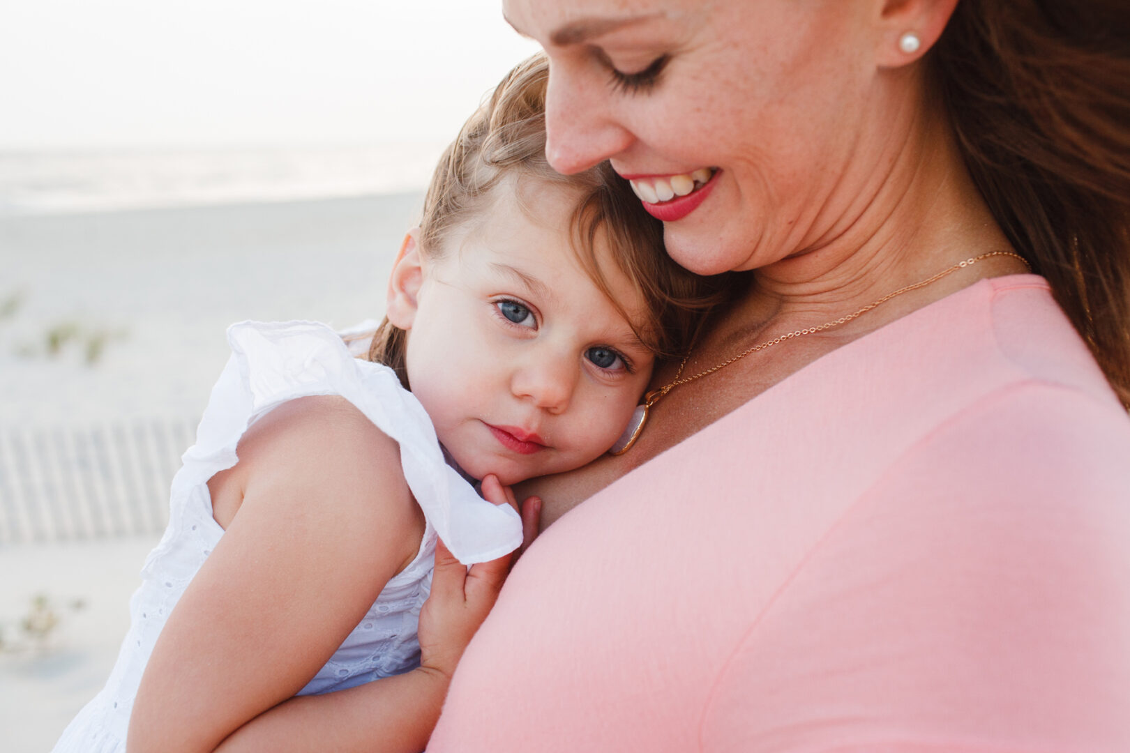 A woman cradles a young child against her chest on a Cape May beach. The child gazes at the camera as the woman smiles, eyes tenderly fixed on the little one, capturing a perfect family photo moment.