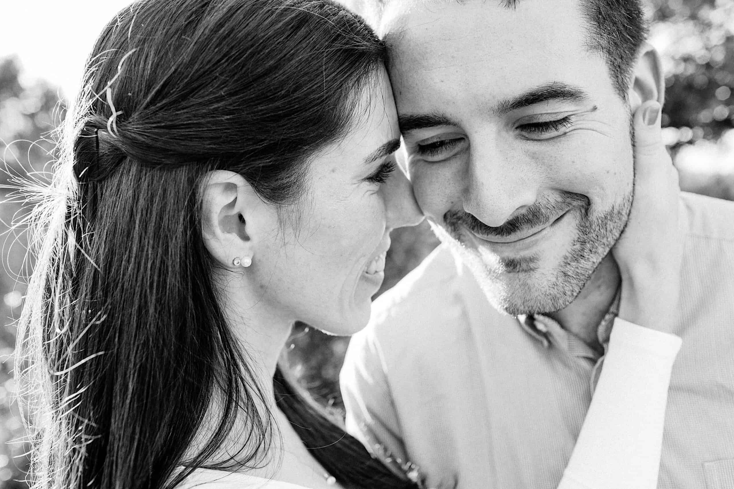 A woman gently holds a man's face as they smile closely at each other outdoors in black and white, evoking the warmth of golden hour fall engagement photos.