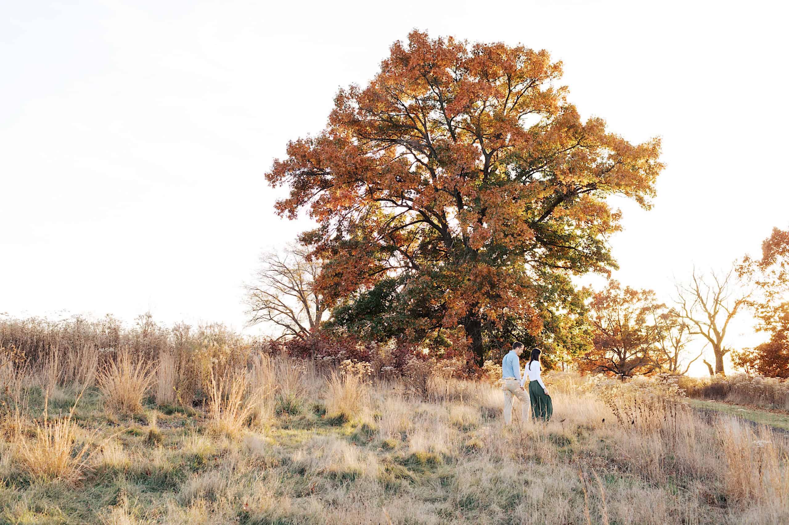 Two people stand together in a grassy field near a large tree with autumn-colored leaves, bathed in golden hour light—perfect for fall engagement photos under the bright sky.