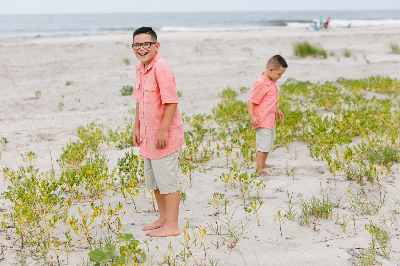 Two boys in matching outfits stand on a sandy Ocean City beach, surrounded by vibrant green and yellow plants. The ocean stretches out behind them as one boy turns to the camera, smiling brightly—capturing the essence of precious family photos.