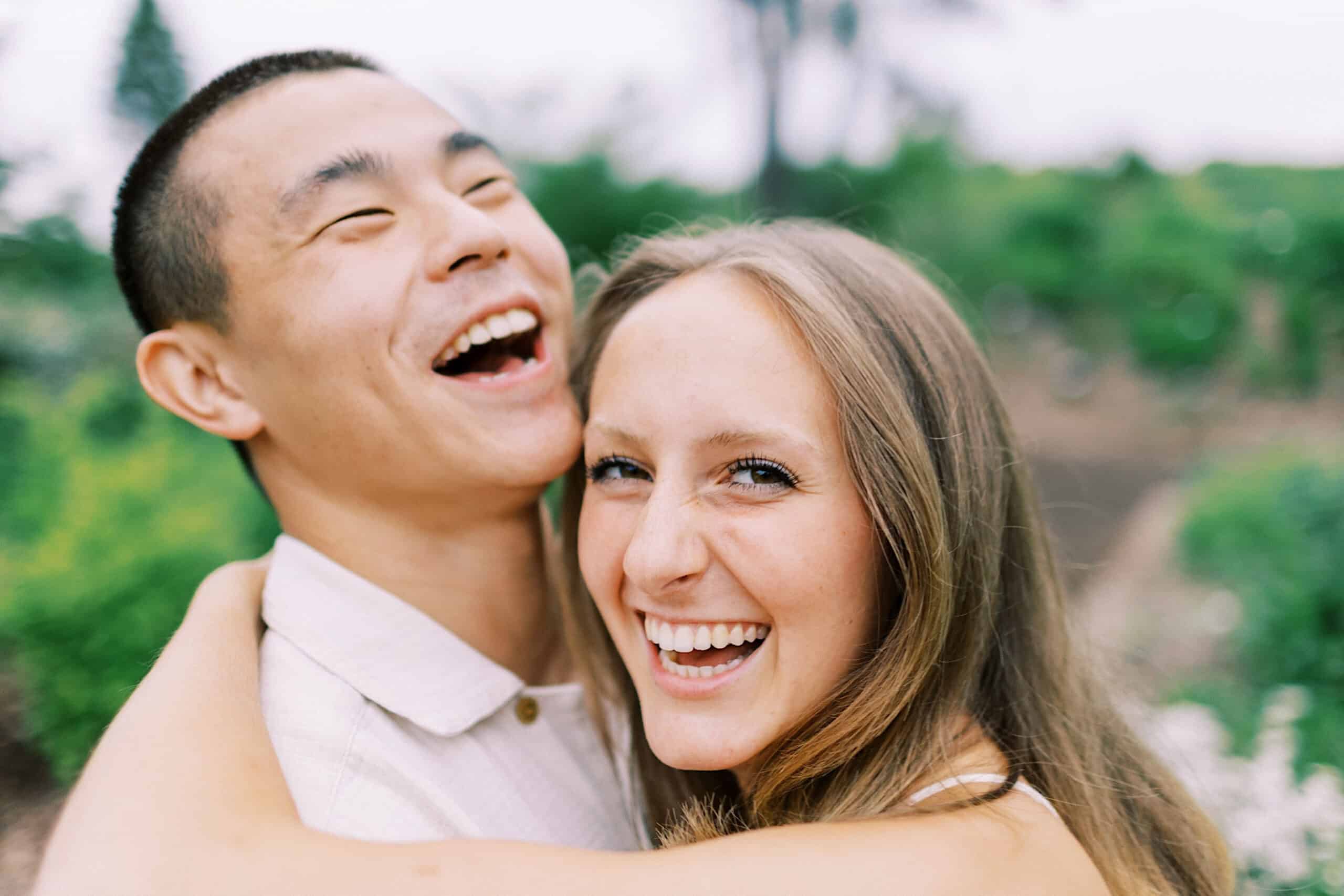 A young man and woman embrace outdoors during their Engagement Photo Session at Twinning Valley Park, both smiling and laughing with greenery blurred in the background.