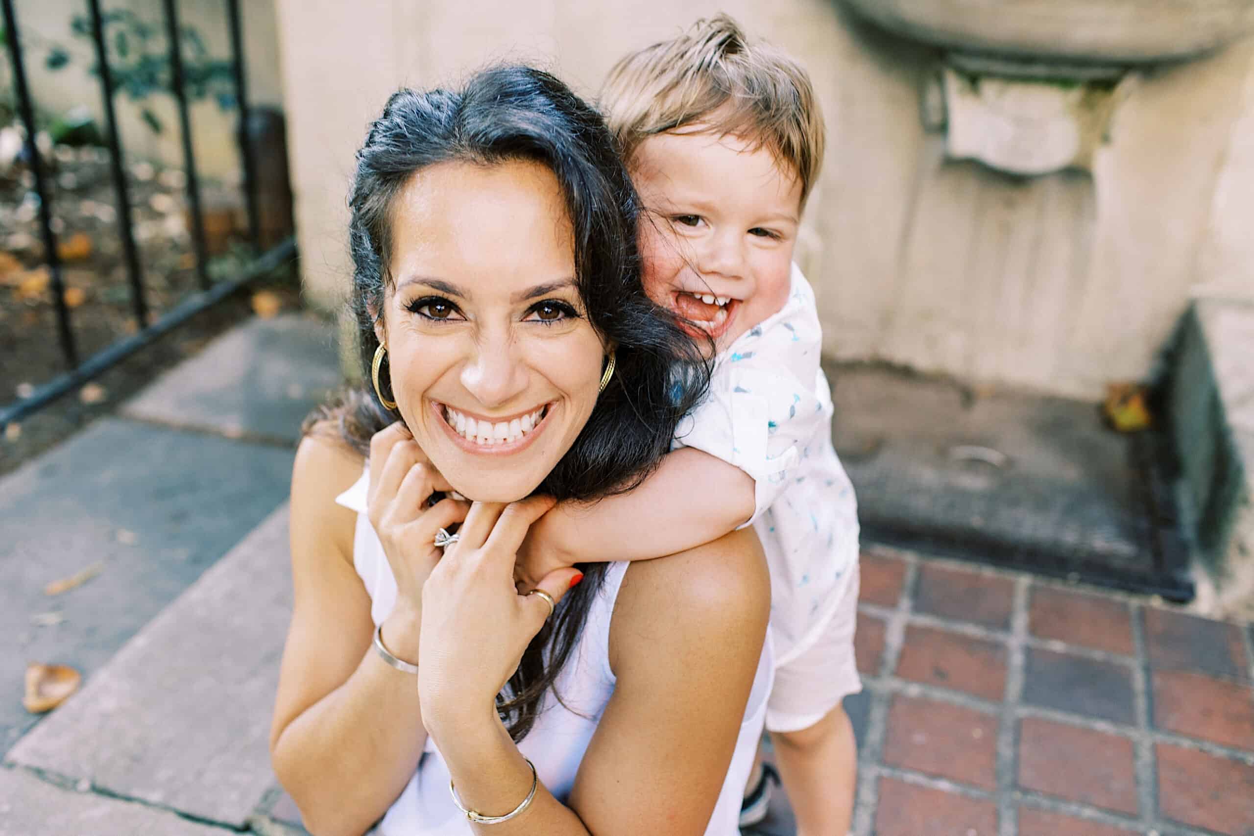 A woman smiles at the camera as a young child hugs her from behind, both appearing happy and relaxed during family photos at Rittenhouse Square.